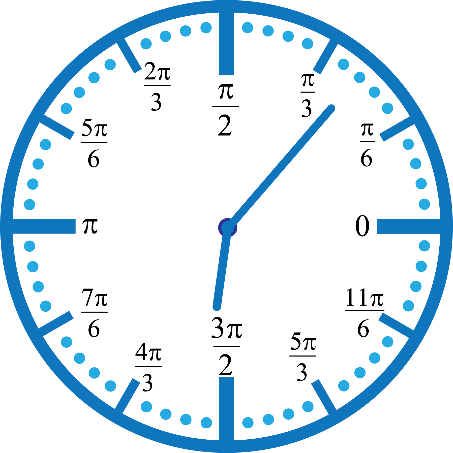 U učionici matematike nalazi se sat na kojemu su umjesto standardnih brojeva upisane vrijednosti kutova u radijanima, kao na trigonometrijskoj kružnici (slika). Za vrijeme nastave, jedan učenik je pogledao na sat i vidio da je velika kazaljka na , a da se mala kazaljka nalazi u intervalu [ , ].