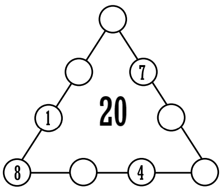 Zadatak: Zadan je magični trokut u kojemu trebate upisati brojeve od 1 do 9 tako da se niti jedan broj ne ponavlja i da zbroj brojeva na odgovarajućoj stranici bude jednak broju u sredini trokuta. Konačno su rješenje svi brojevi zapisani po redu počevši od broja 8 i gledajući u smjeru obrnutom od kazaljke na satu.
